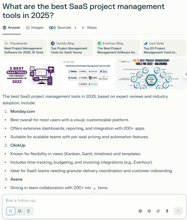 Here’s a simple test: ask ChatGPT or Perplexity “What are the best SaaS project management tools in 2025?” You’ll see Monday, Asana, ClickUp, or Notion – but not your brand.