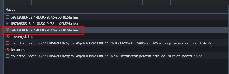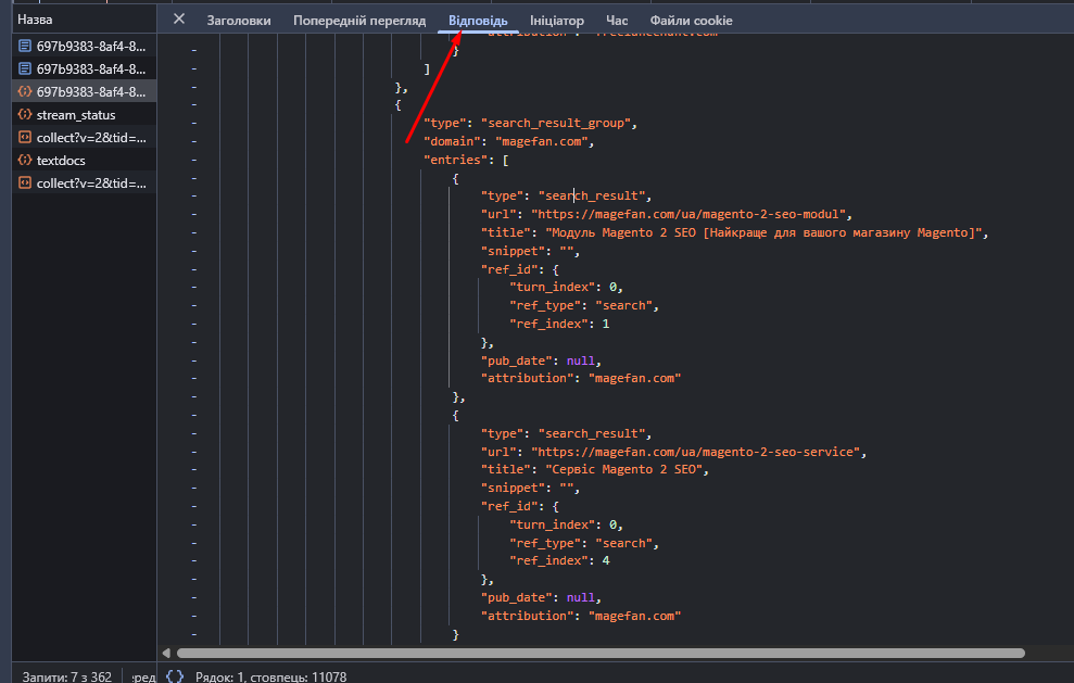 Натисніть на запит, який ми відфільтрували, і перейдіть у вкладку Response (Відповідь).