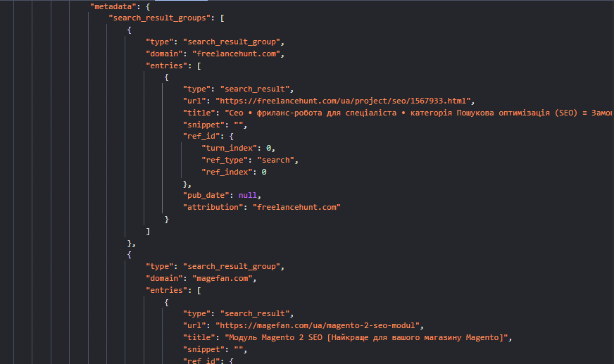 - search_results: Тут перелічені всі сайти, які модель фізично відкрила і просканувала. Якщо ваші конкуренти там є, а ви – ні, час переглянути технічне SEO.