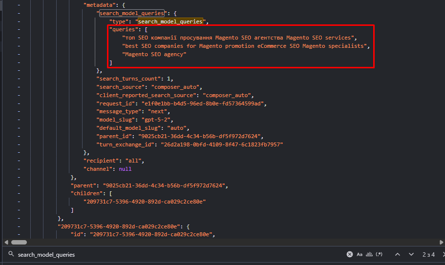Щоб не гортати кілометри коду, тисніть Ctrl + F і шукайте ключ: search_model_queries. Це – найцінніше. Ви побачите список фраз, які модель реально гуглила.