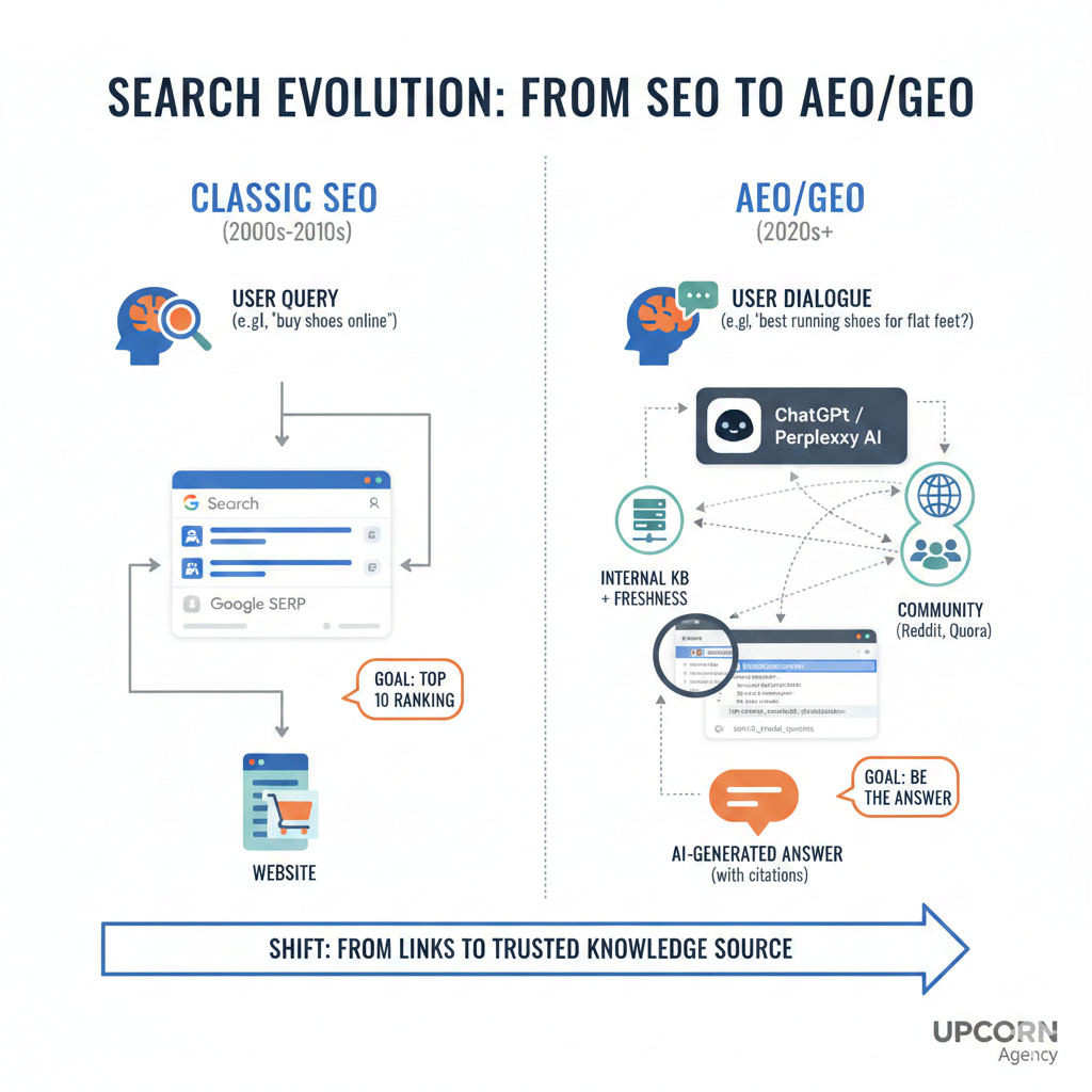 Ми в UPCORN Agency бачимо, як класичне SEO поступово перетікає в AEO (Answer Engine Optimization). Раніше шлях клієнта починався з Google, сьогодні він дедалі частіше стартує з питання до ChatGPT. Наприклад: «Які SaaS-рішення допоможуть автоматизувати маркетинг у 2026-му?».